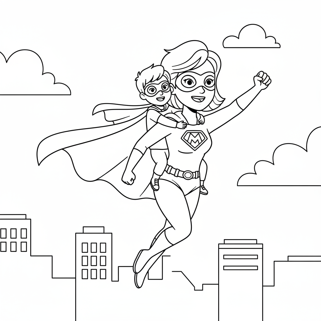 A delightful mother's day coloring page featuring mom superhero with cape flying with child on back. Perfect for kids and adults who love coloring!