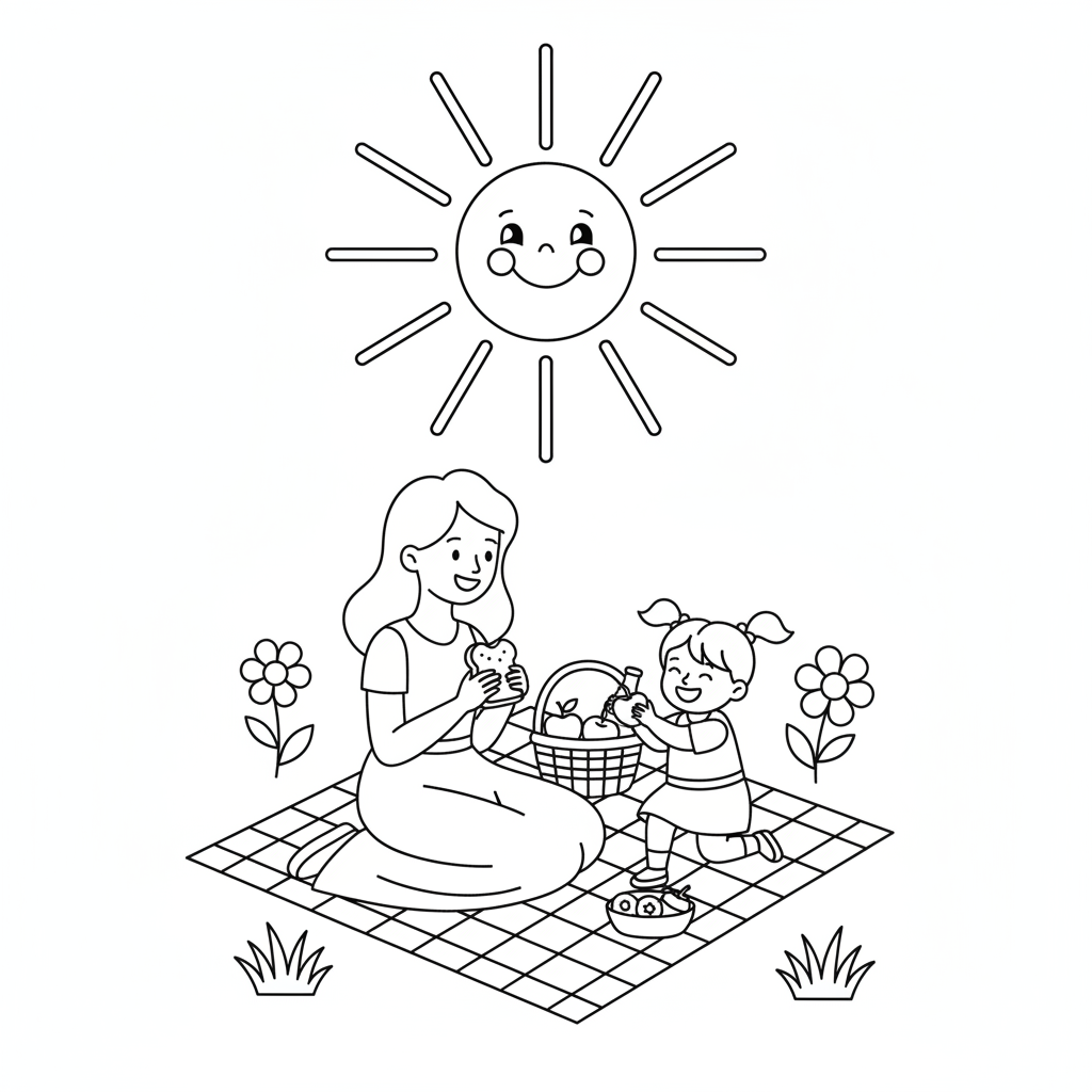 A delightful mother's day coloring page featuring sun with smiley face shining on mom and child picnic. Perfect for kids and adults who love coloring!