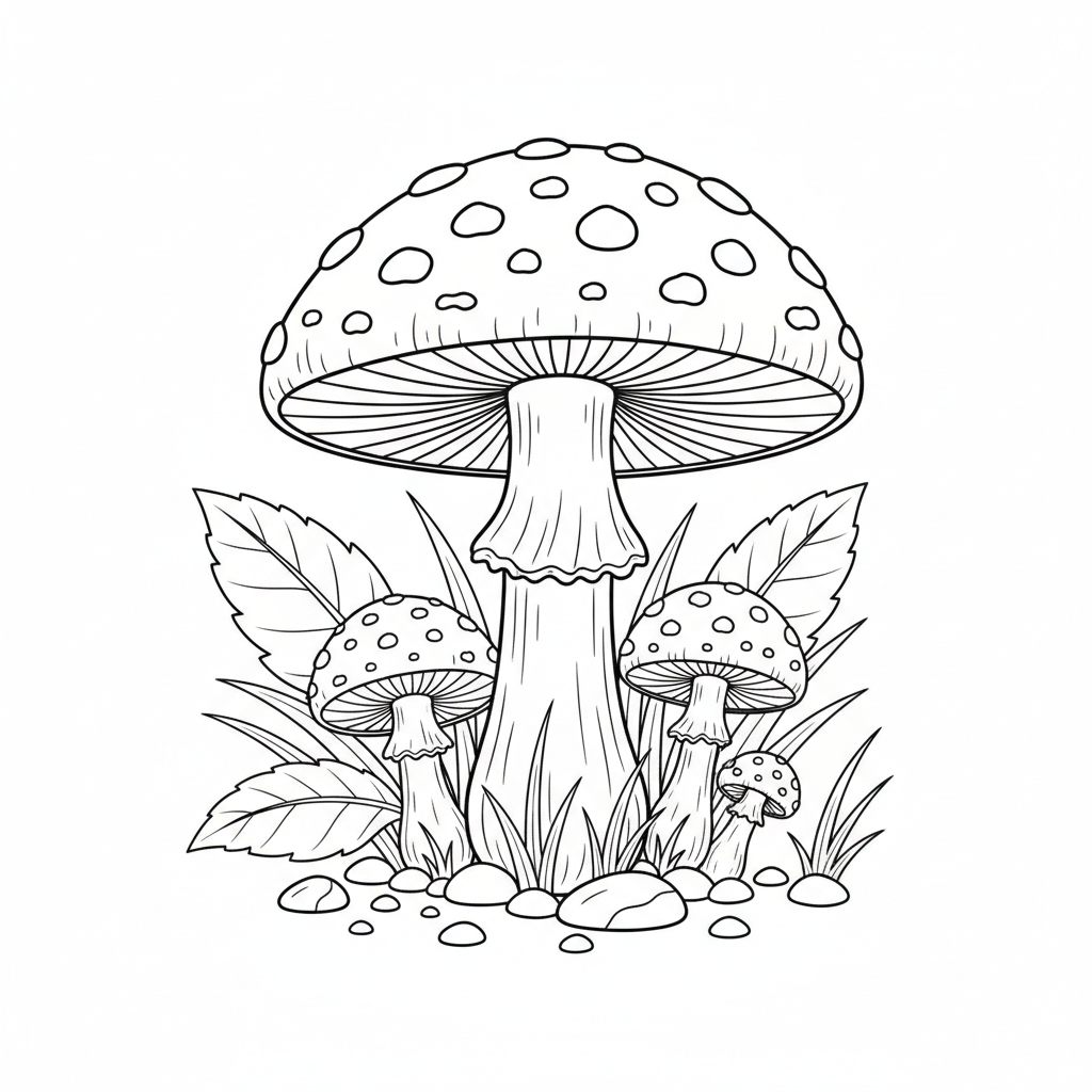 Beautiful classic red and white spotted amanita mushroom coloring page for kids and adults. Free to download and print.