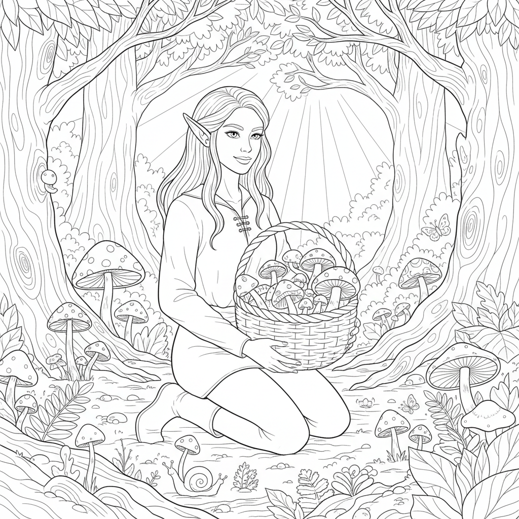 Beautiful elf collecting mushrooms in woven basket in woods coloring page for kids and adults. Free to download and print.