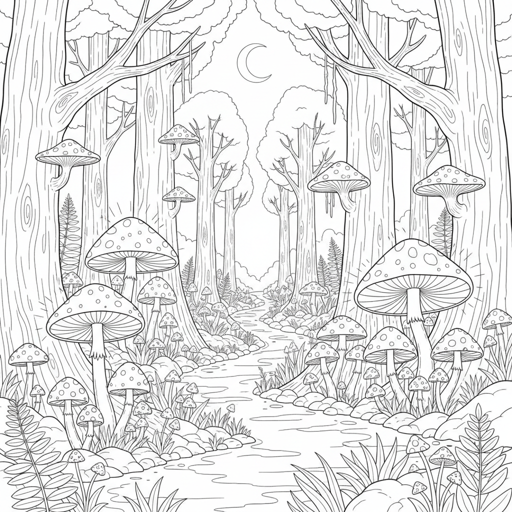 Beautiful forest path lined with bioluminescent mushrooms glowing coloring page for kids and adults. Free to download and print.