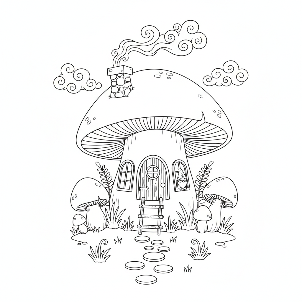 Beautiful gnome home inside giant mushroom with chimney smoke coloring page for kids and adults. Free to download and print.