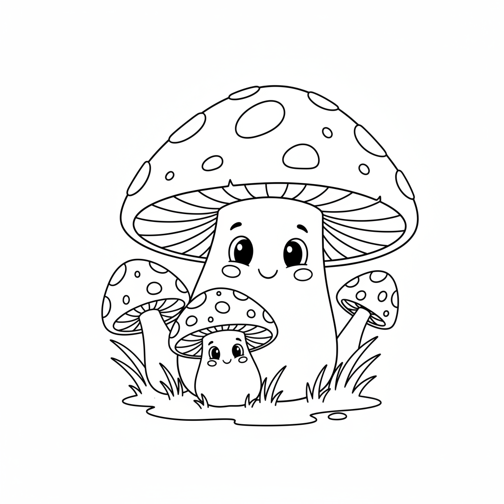 Beautiful happy toadstool family with parent and baby mushrooms coloring page for kids and adults. Free to download and print.