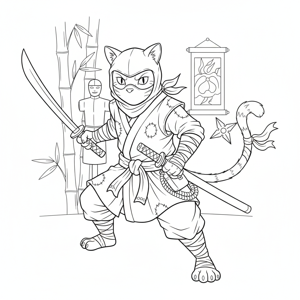 Beautiful ninja animal cat warrior coloring page for kids and adults. Free to download and print.