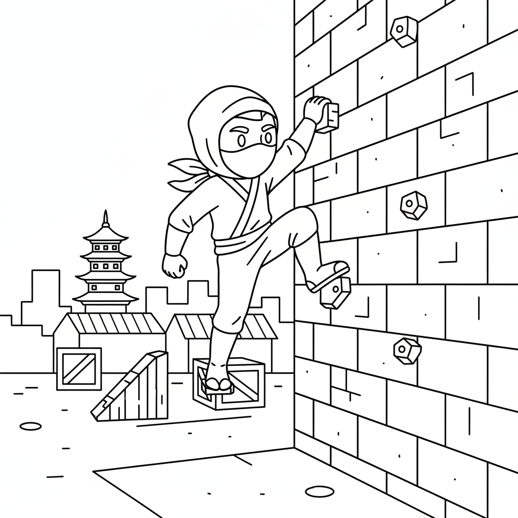 A delightful ninja coloring page featuring ninja climbing wall parkour athletic acrobatic. Perfect for kids and adults who love coloring!