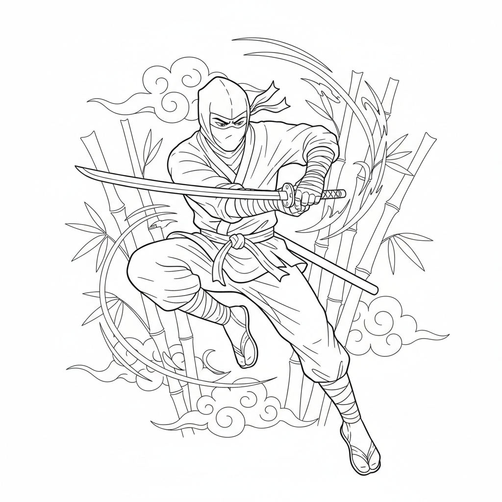 Beautiful ninja in action pose with sword coloring page for kids and adults. Free to download and print.