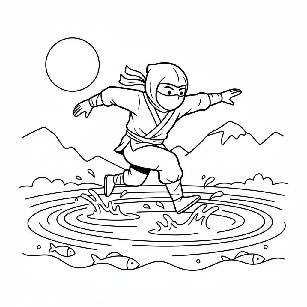 A delightful ninja coloring page featuring ninja running across water surface tension fast. Perfect for kids and adults who love coloring!