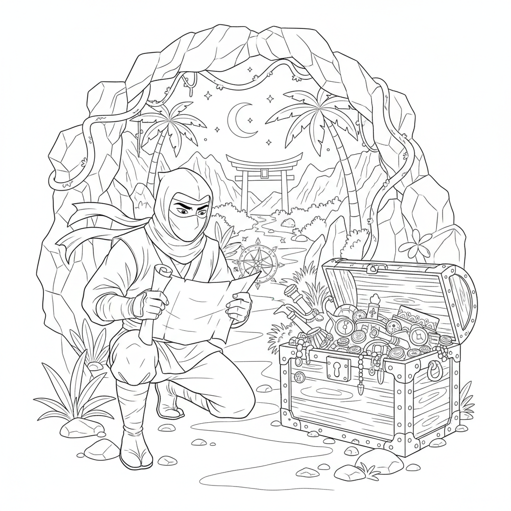 Beautiful ninja treasure hunting adventure coloring page for kids and adults. Free to download and print.