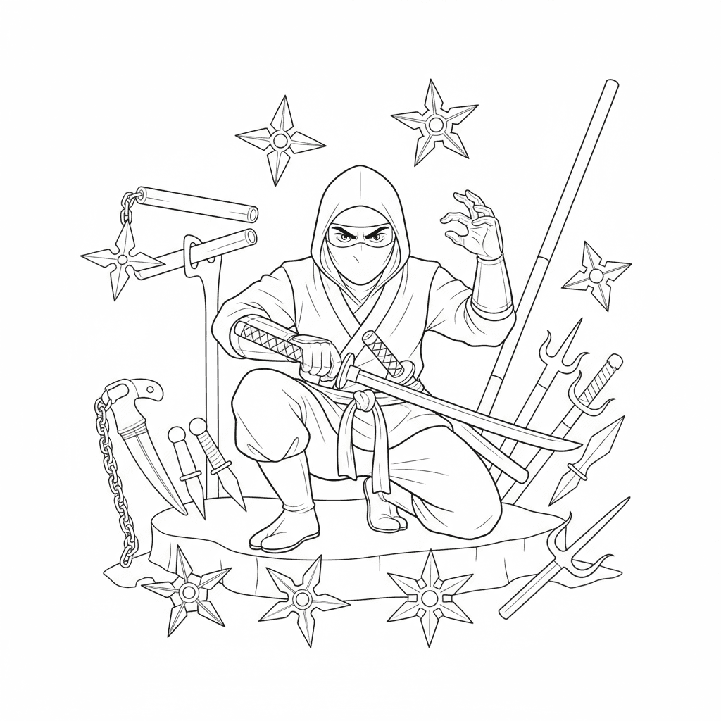 Beautiful ninja with weapons collection coloring page for kids and adults. Free to download and print.