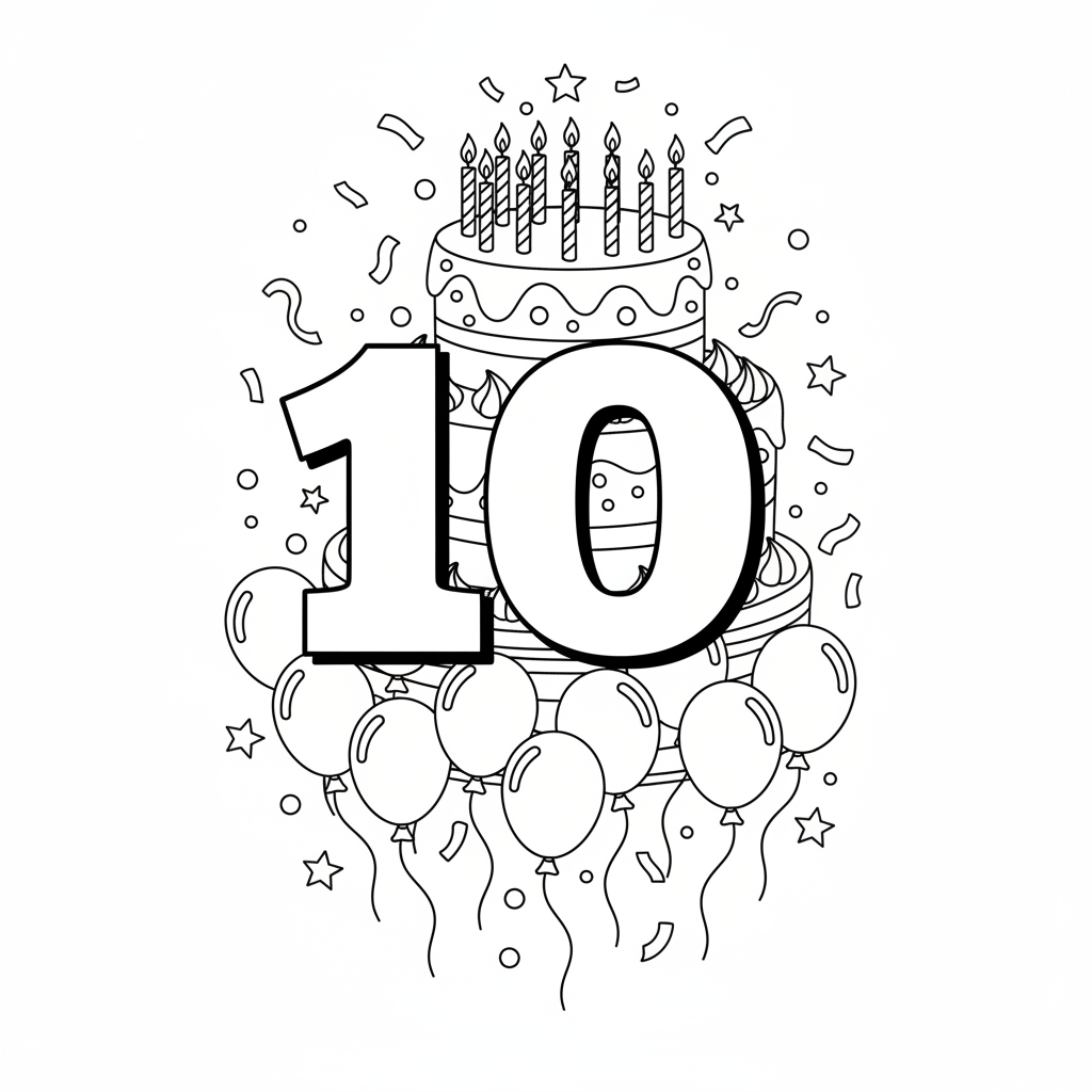 A delightful number coloring page featuring number 10 with ten candles on birthday cake celebration. Perfect for kids and adults who love coloring!