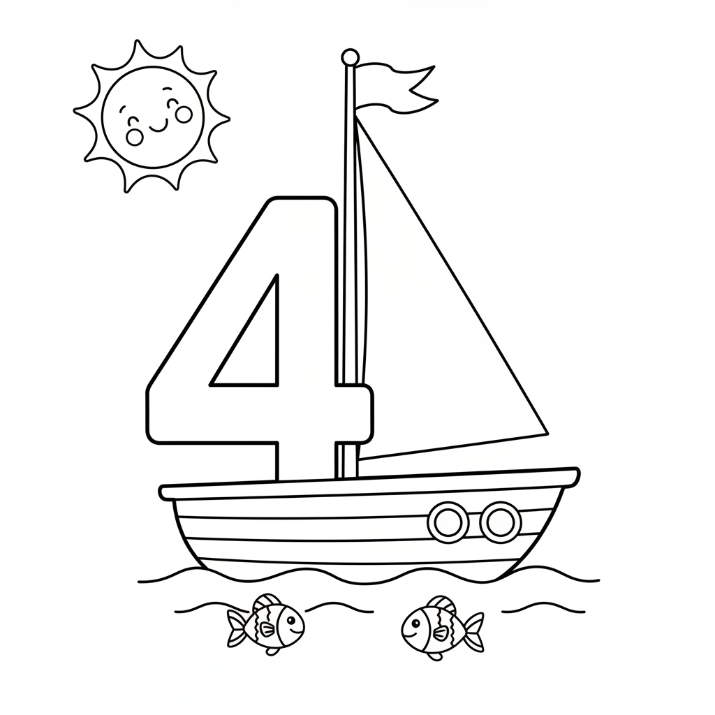 A delightful number coloring page featuring number 4 as a sailboat on calm ocean water. Perfect for kids and adults who love coloring!