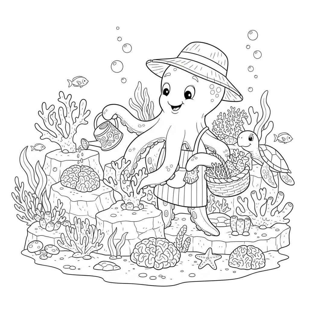 A delightful octopus coloring page featuring octopus gardener planting coral tending reef. Perfect for kids and adults who love coloring!