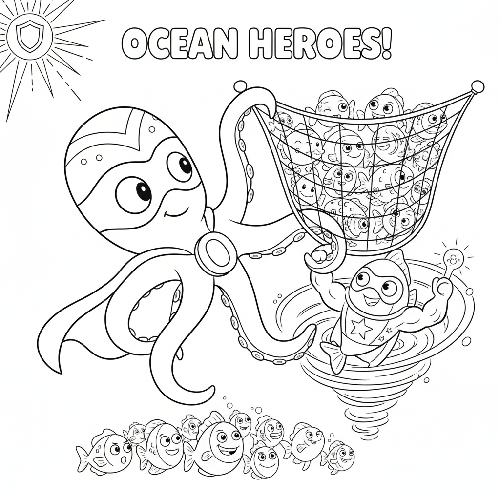A delightful octopus coloring page featuring octopus superhero saving fish hero rescue. Perfect for kids and adults who love coloring!