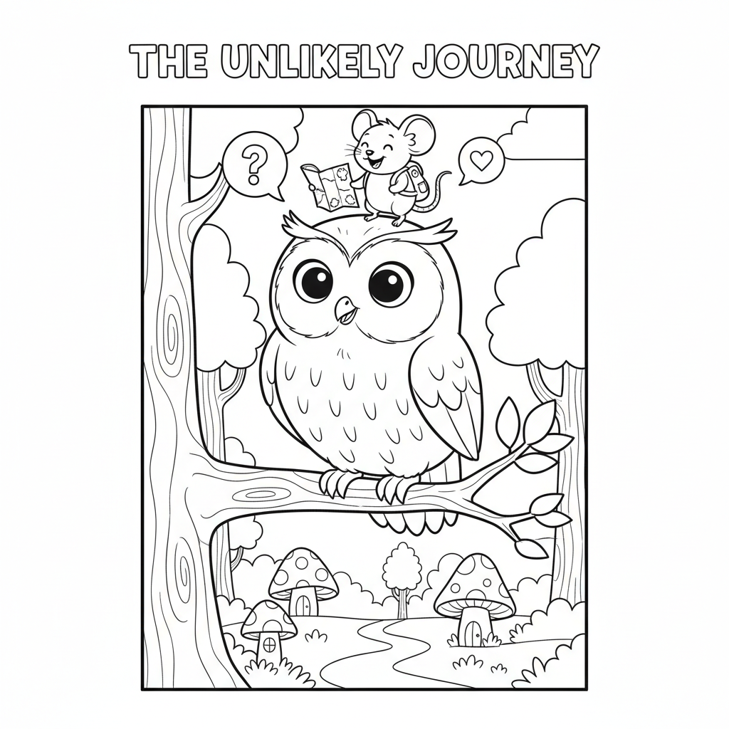 A delightful owl coloring page featuring owl and mouse unlikely friends story cartoon. Perfect for kids and adults who love coloring!