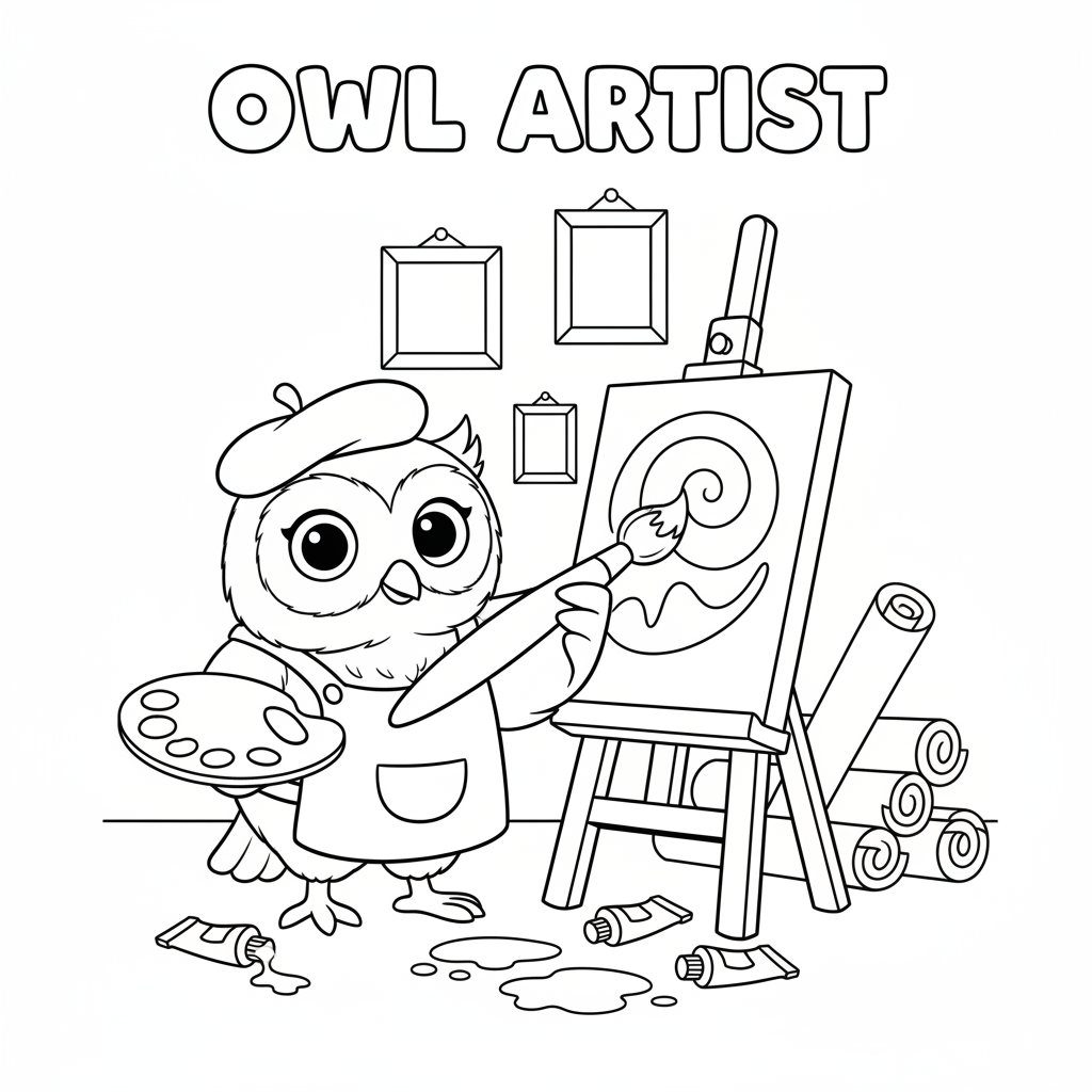 A delightful owl coloring page featuring owl artist painting picture creative canvas brush. Perfect for kids and adults who love coloring!