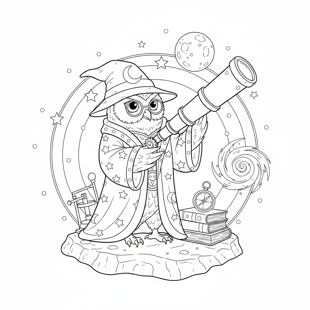 Beautiful owl astronomer with telescope coloring page for kids and adults. Free to download and print.