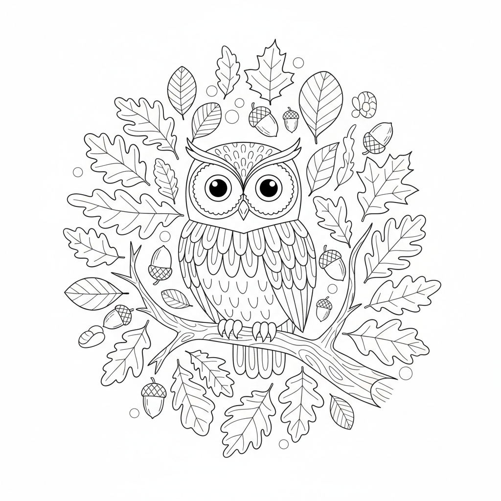 Beautiful owl in autumn leaves coloring page for kids and adults. Free to download and print.