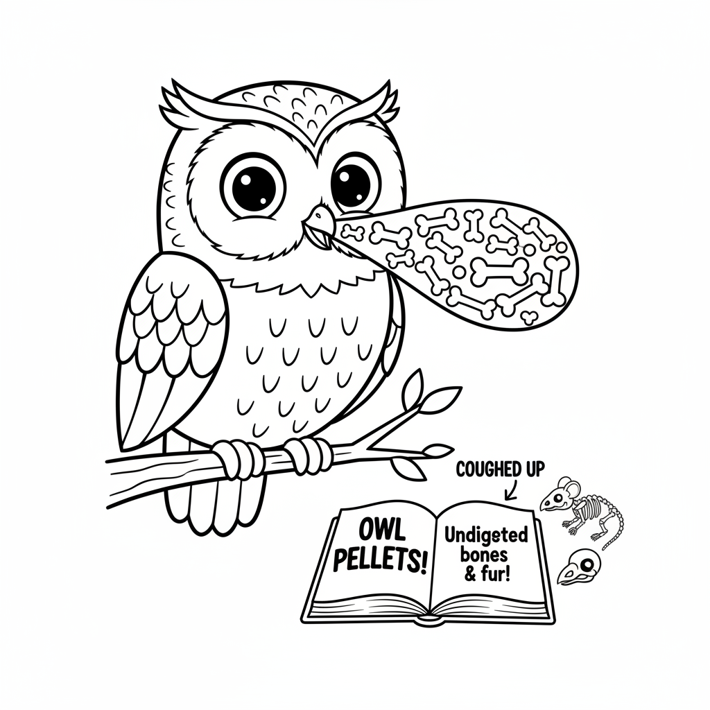 A delightful owl coloring page featuring owl pellet regurgitating educational nature fact. Perfect for kids and adults who love coloring!