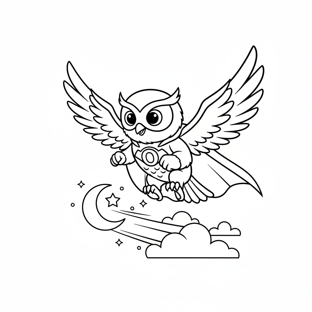 A delightful owl coloring page featuring owl superhero flying night cape rescue hero. Perfect for kids and adults who love coloring!