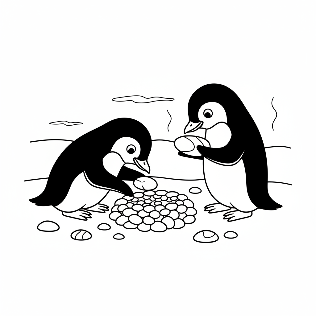 A delightful penguin coloring page featuring adelie penguin building a pebble nest and offering a stone to its mate. Perfect for kids and adults who love coloring!