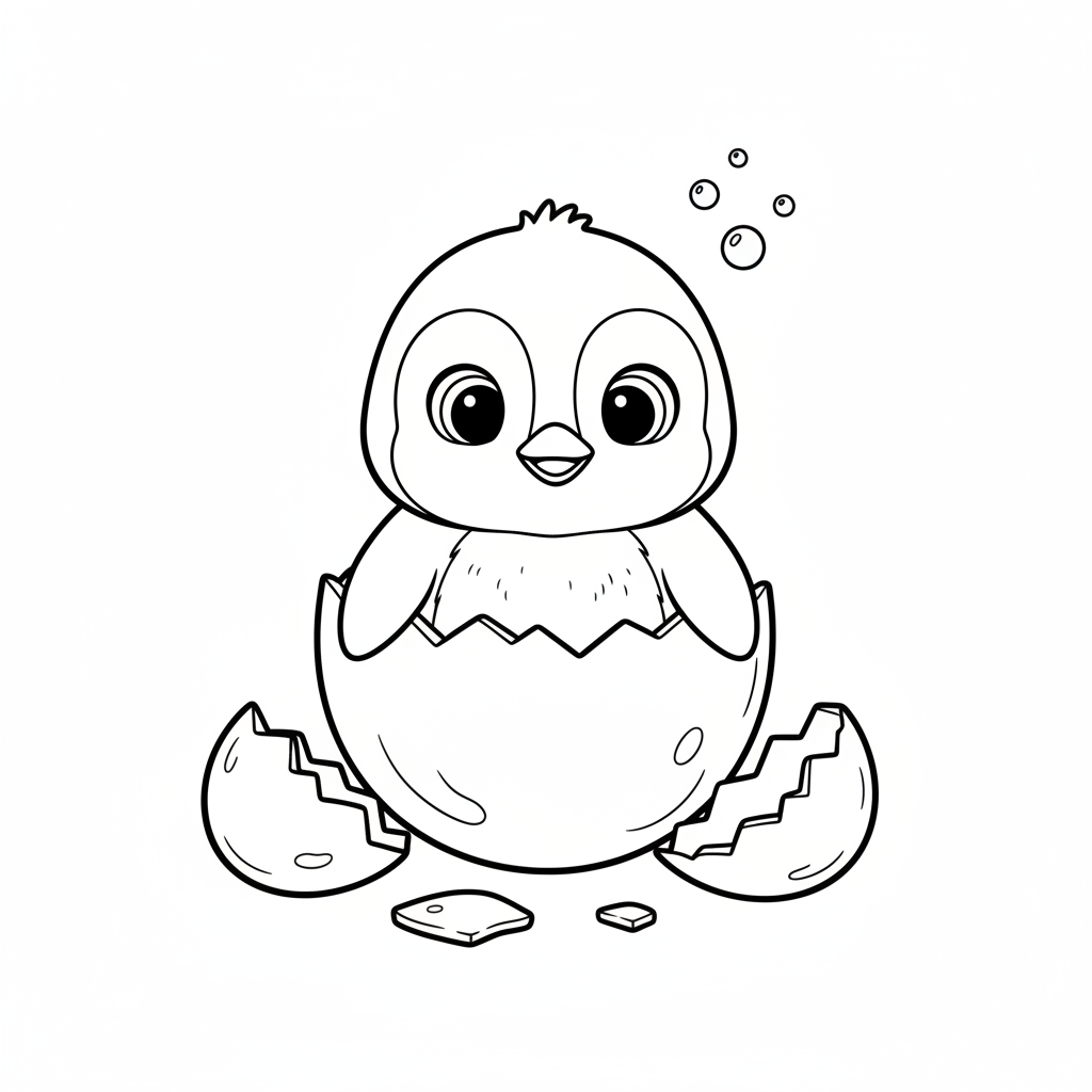 A delightful penguin coloring page featuring baby penguin hatching out of an egg with shell pieces around. Perfect for kids and adults who love coloring!