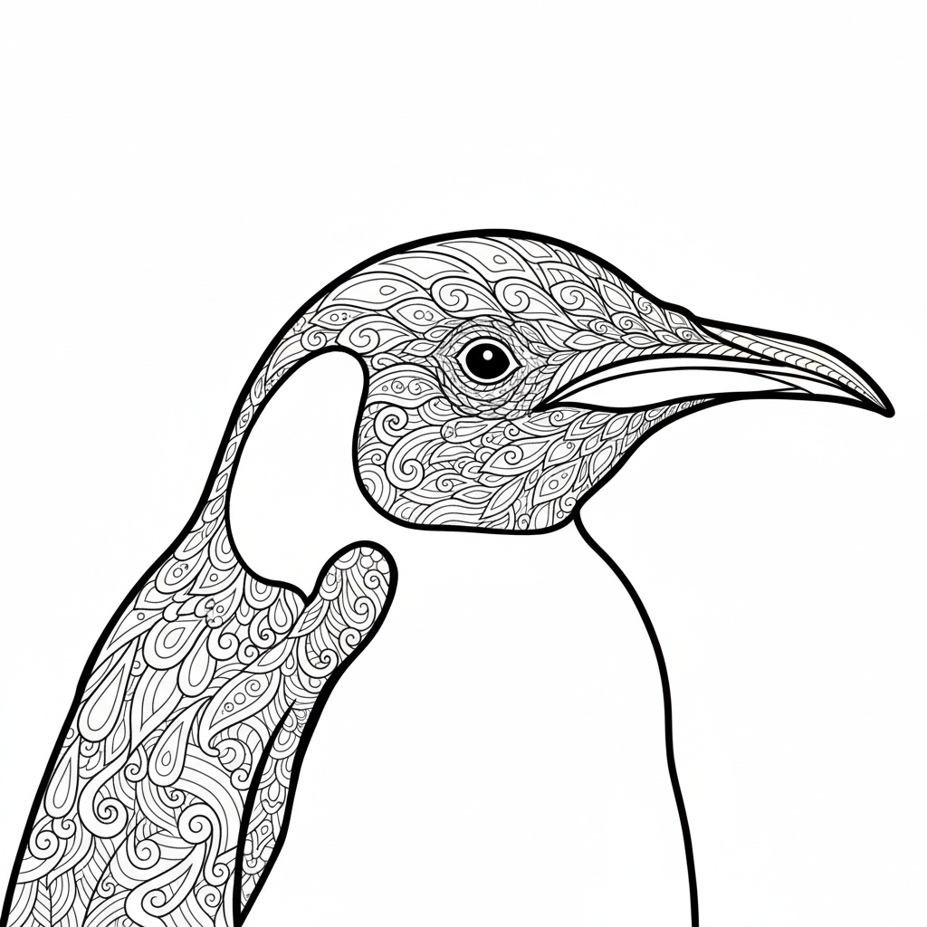 A delightful penguin coloring page featuring detailed realistic emperor penguin portrait with intricate feather patterns. Perfect for kids and adults who love coloring!