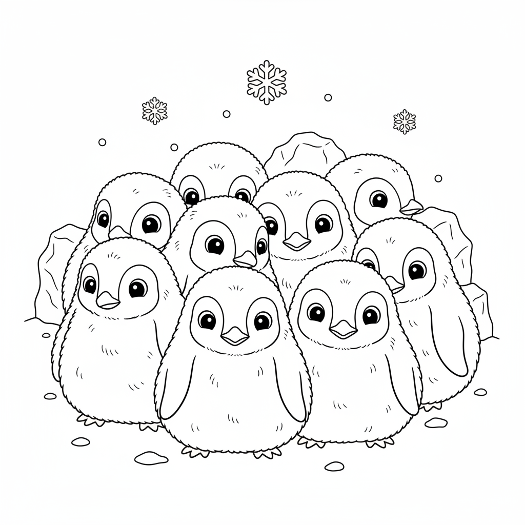 A delightful penguin coloring page featuring group of penguin chicks in a creche huddling for warmth. Perfect for kids and adults who love coloring!