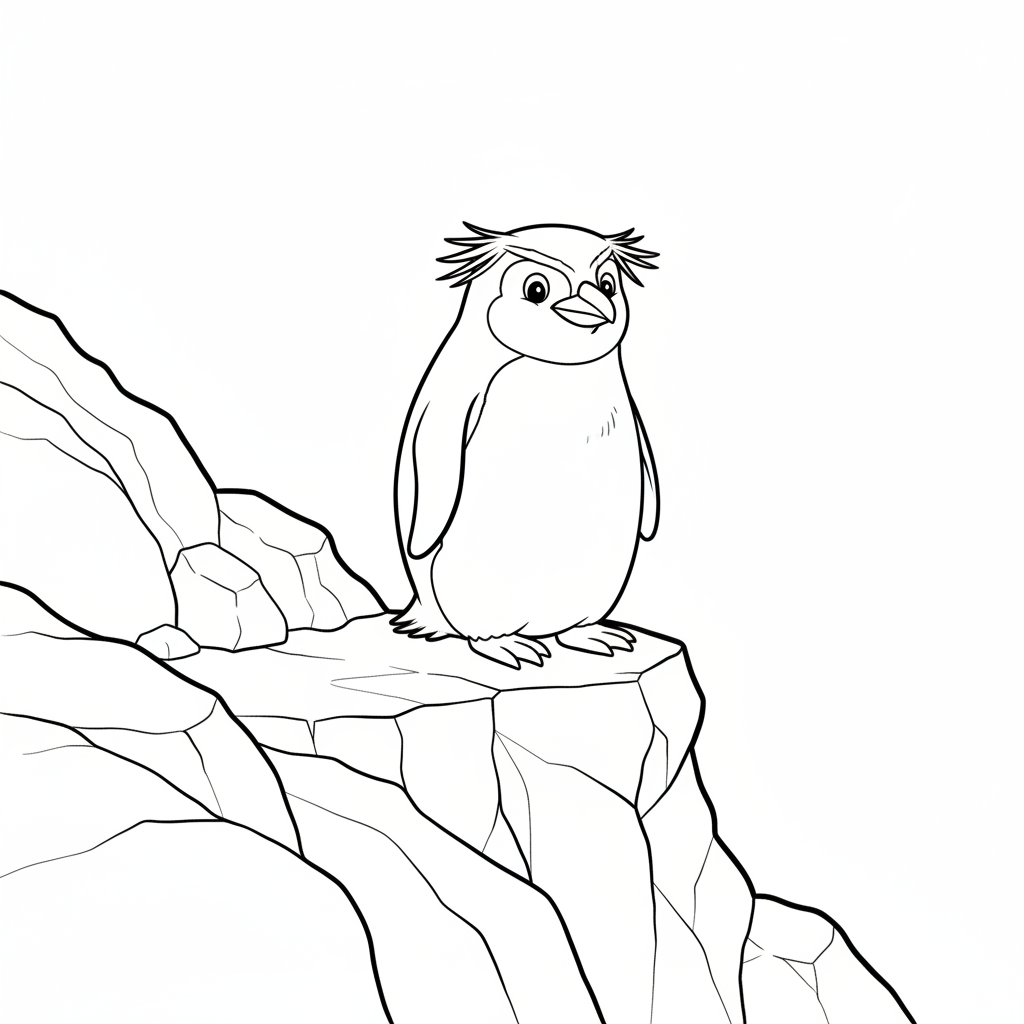 A delightful penguin coloring page featuring macaroni penguin with bright golden crest feathers on a rocky cliff. Perfect for kids and adults who love coloring!