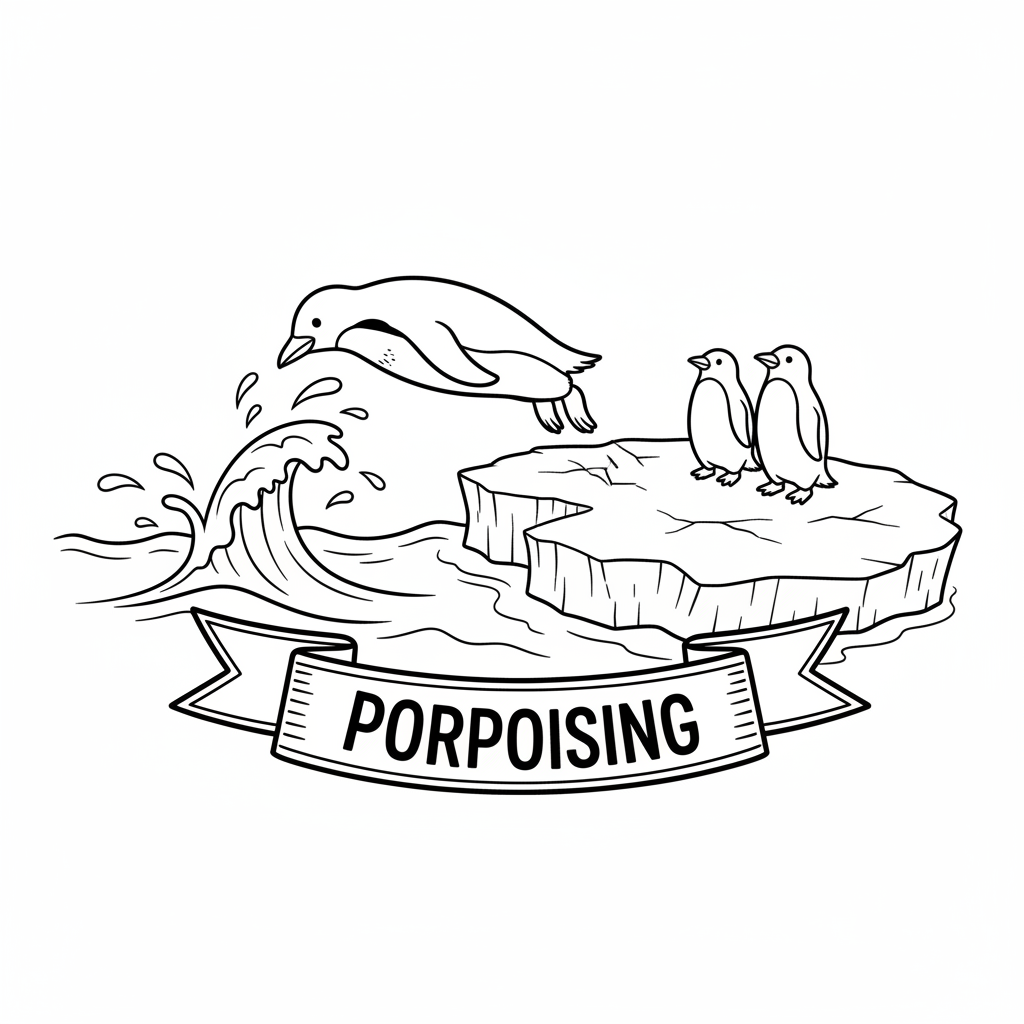 A delightful penguin coloring page featuring penguin leaping out of the water onto an ice shelf called porpoising. Perfect for kids and adults who love coloring!
