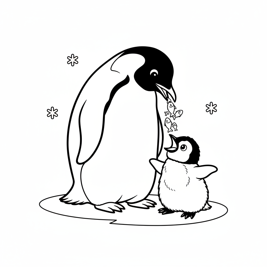 A delightful penguin coloring page featuring penguin parent feeding regurgitated fish to hungry baby chick. Perfect for kids and adults who love coloring!