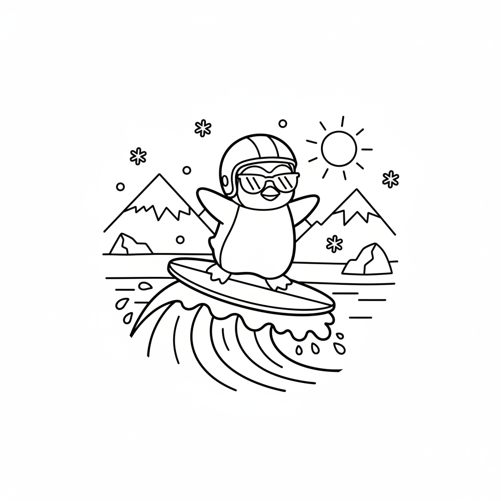 A delightful penguin coloring page featuring penguin surfing on a small wave near an Antarctic shoreline. Perfect for kids and adults who love coloring!