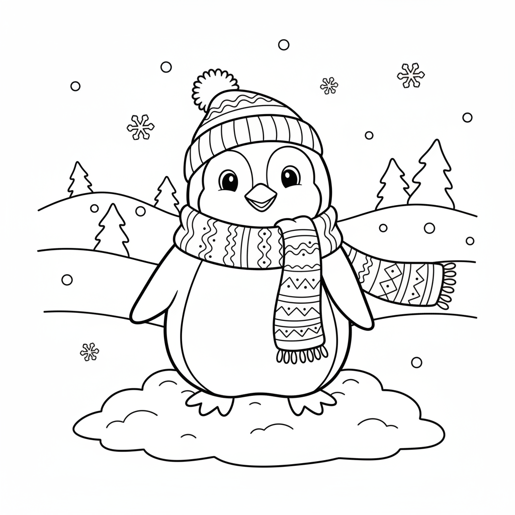 A delightful penguin coloring page featuring penguin wearing a winter hat and scarf in the snow. Perfect for kids and adults who love coloring!