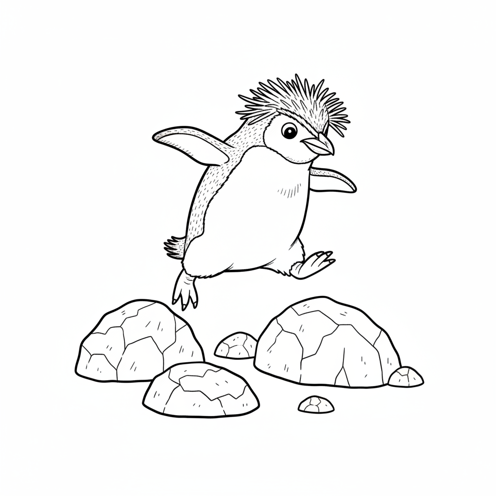 A delightful penguin coloring page featuring rockhopper penguin with spiky yellow head feathers hopping on rocks. Perfect for kids and adults who love coloring!