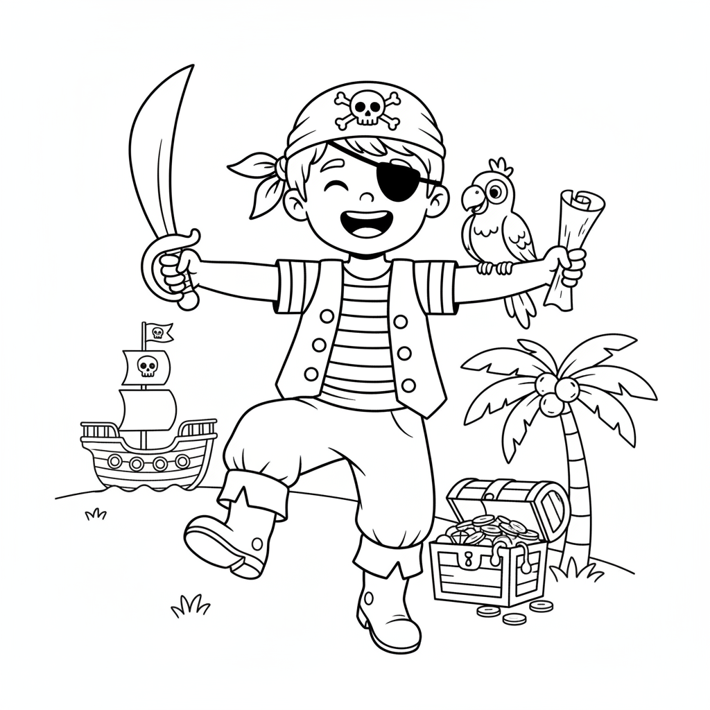 A delightful pirate coloring page featuring pirate costume child dress up playing fun. Perfect for kids and adults who love coloring!