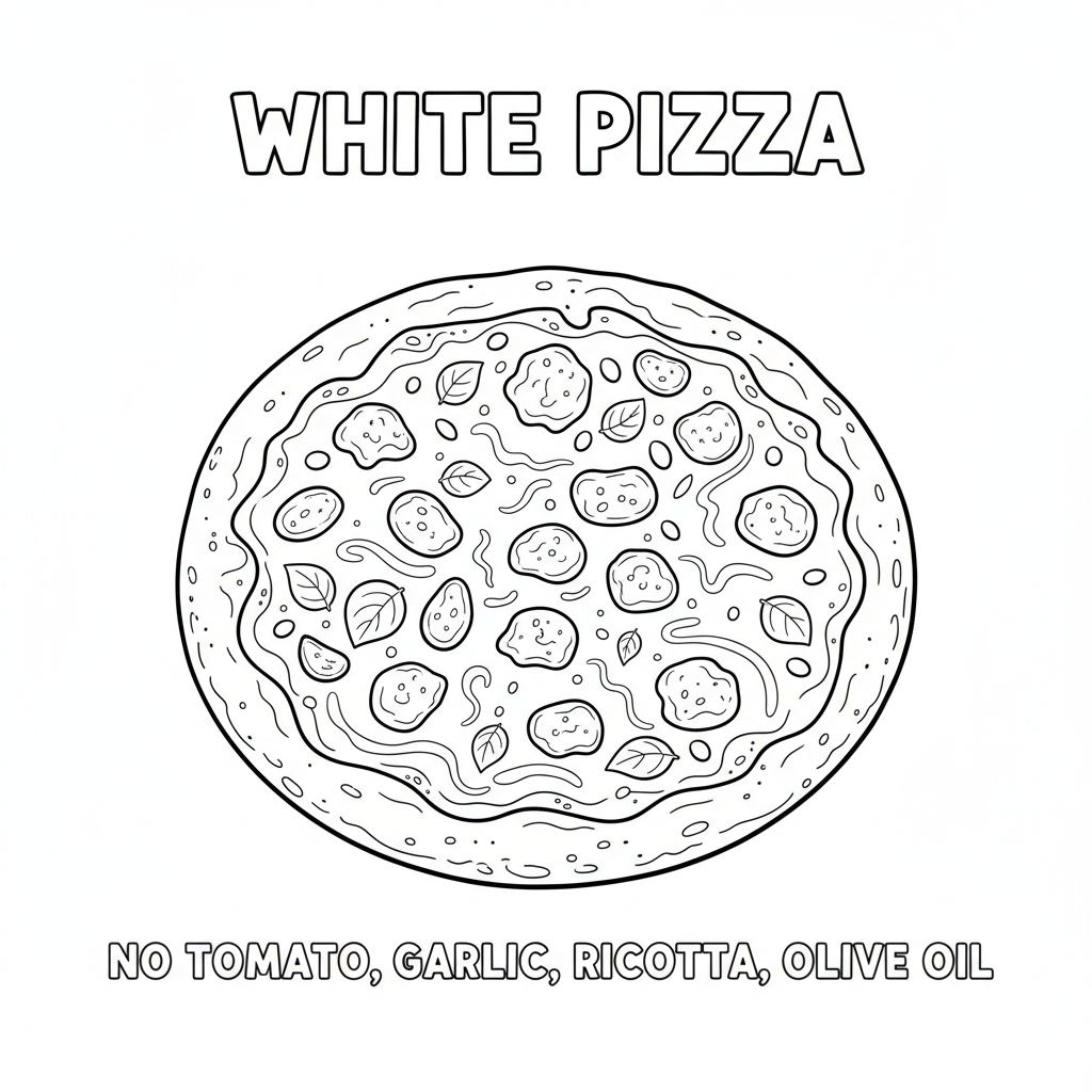 A delightful pizza coloring page featuring white pizza no tomato garlic ricotta olive oil. Perfect for kids and adults who love coloring!