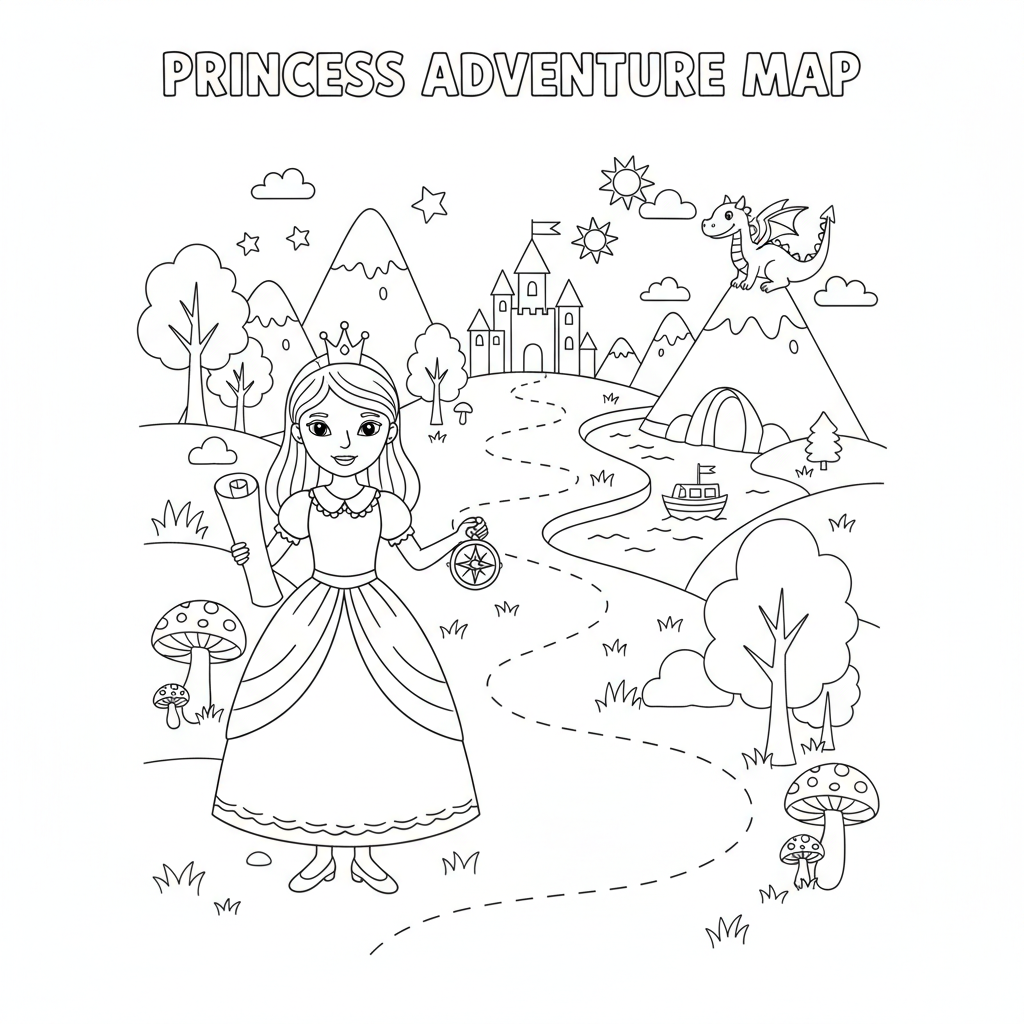 A delightful princess coloring page featuring princess adventure quest journey brave exploration map. Perfect for kids and adults who love coloring!