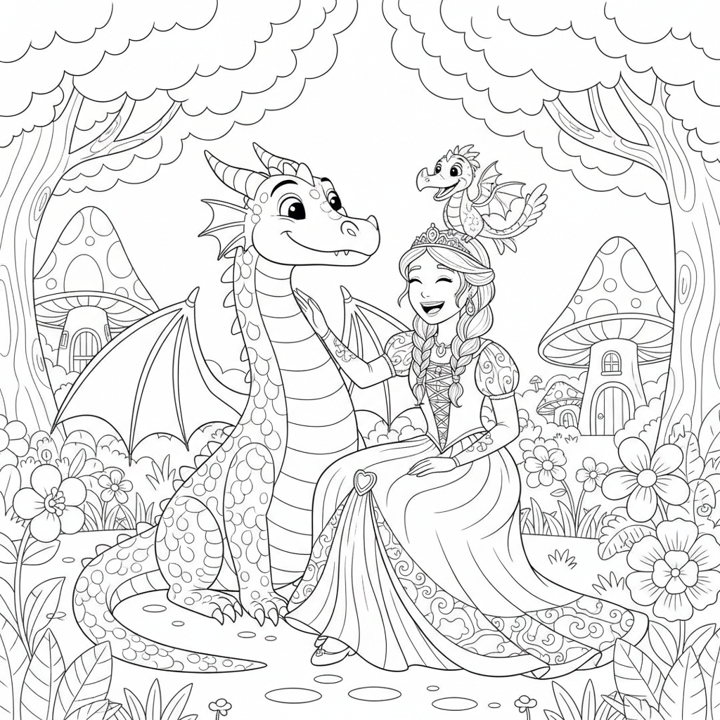 Beautiful princess and dragon friends coloring page for kids and adults. Free to download and print.