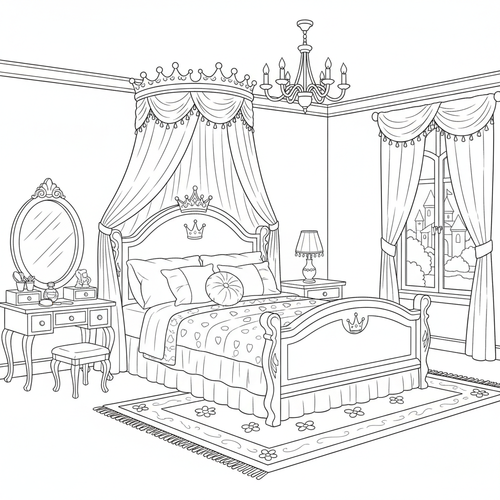 A delightful princess coloring page featuring princess bedroom canopy bed elegant royal chambers. Perfect for kids and adults who love coloring!