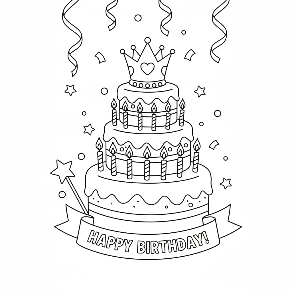A delightful princess coloring page featuring princess birthday celebration cake candles party crown. Perfect for kids and adults who love coloring!