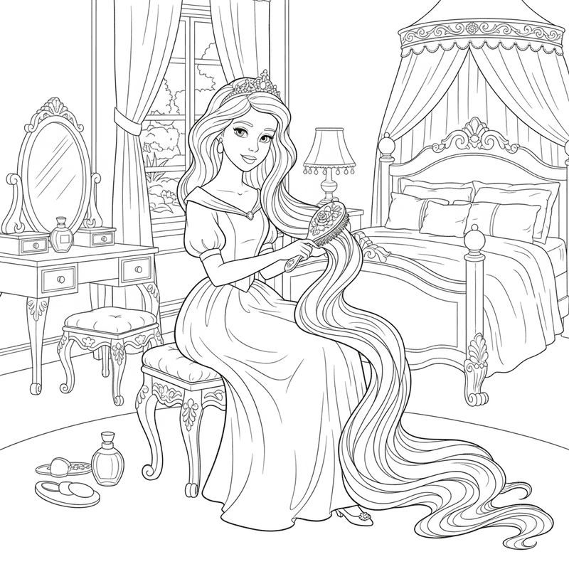 Beautiful princess brushing long hair coloring page for kids and adults. Free to download and print.