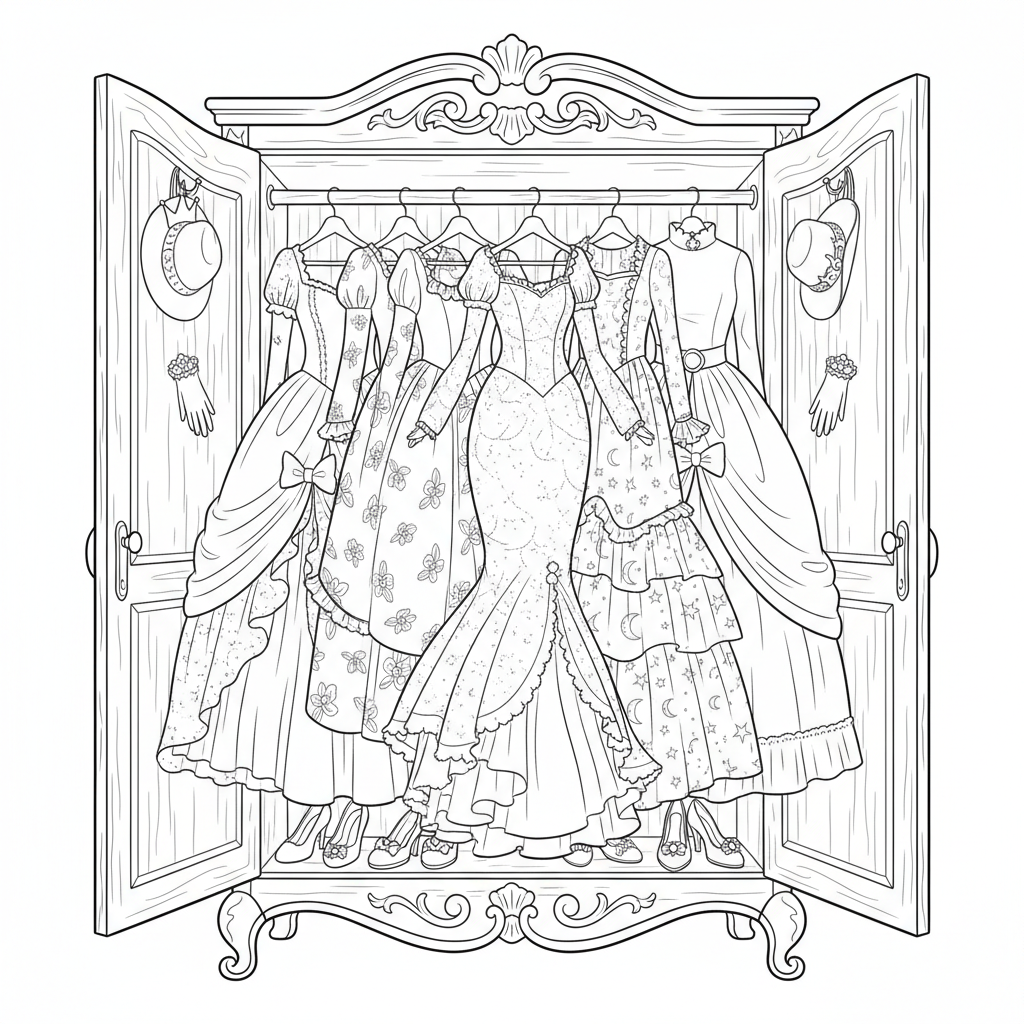 A delightful princess coloring page featuring princess dress collection wardrobe closet gowns variety. Perfect for kids and adults who love coloring!