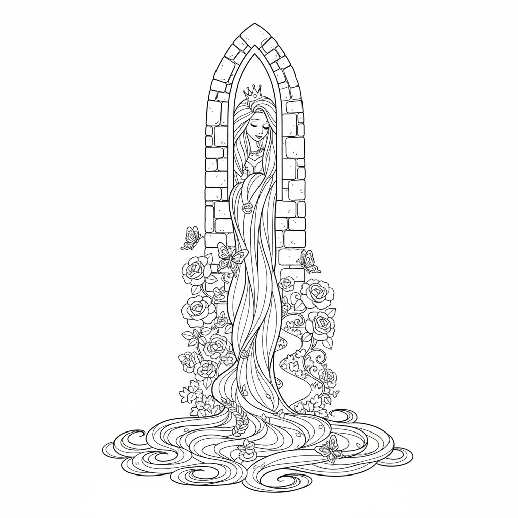 A delightful princess coloring page featuring princess tower window long hair fairy tale classic. Perfect for kids and adults who love coloring!