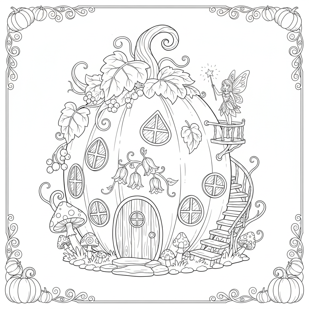 Beautiful pumpkin house fairy home coloring page for kids and adults. Free to download and print.