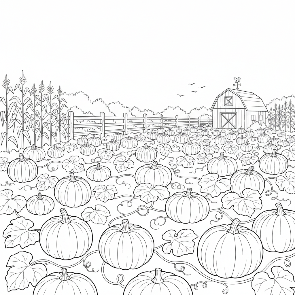Beautiful pumpkin patch scene coloring page for kids and adults. Free to download and print.