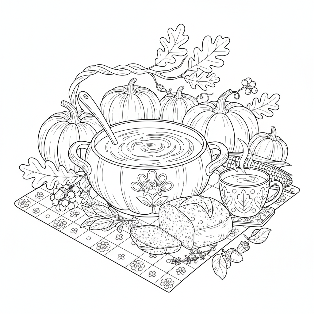 Beautiful pumpkin soup autumn meal coloring page for kids and adults. Free to download and print.