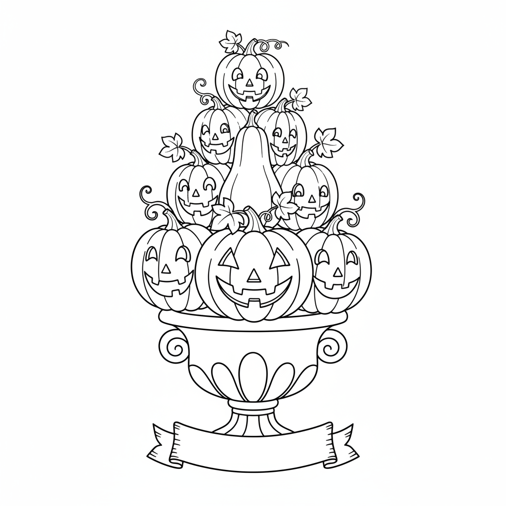 A delightful pumpkin coloring page featuring pumpkin topiary stacked display creative decoration. Perfect for kids and adults who love coloring!