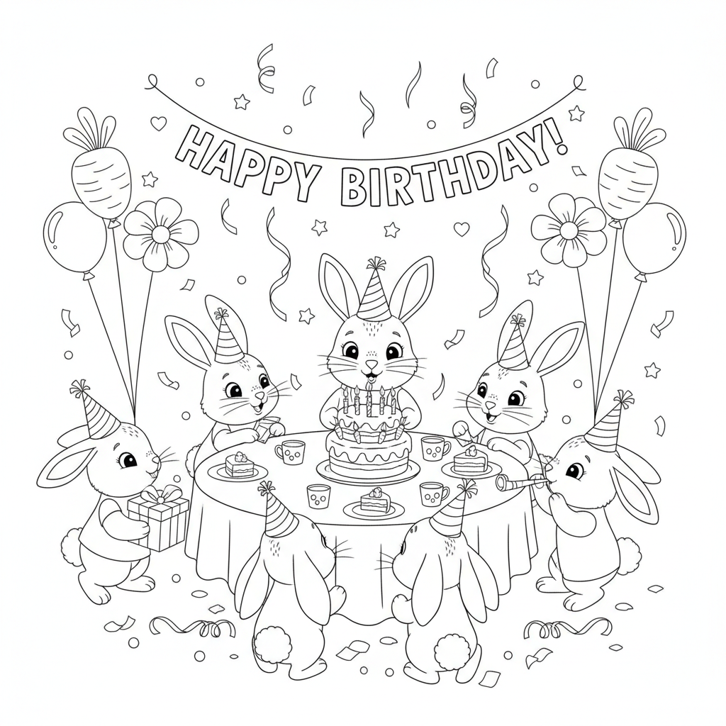 Beautiful rabbit birthday party coloring page for kids and adults. Free to download and print.