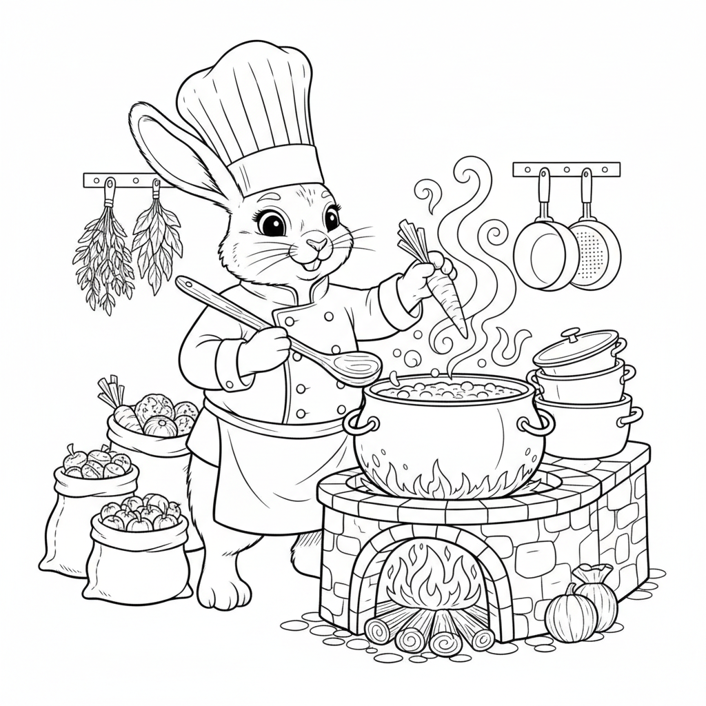 Beautiful rabbit chef cooking stew coloring page for kids and adults. Free to download and print.
