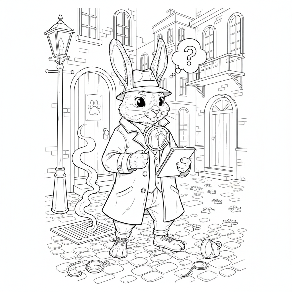 Beautiful rabbit detective mystery coloring page for kids and adults. Free to download and print.