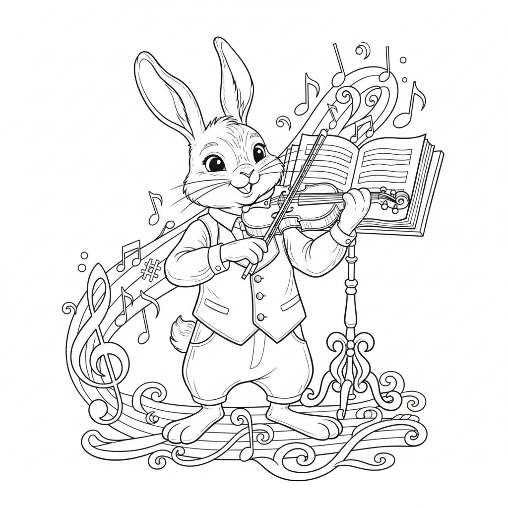 Beautiful rabbit musician violin coloring page for kids and adults. Free to download and print.